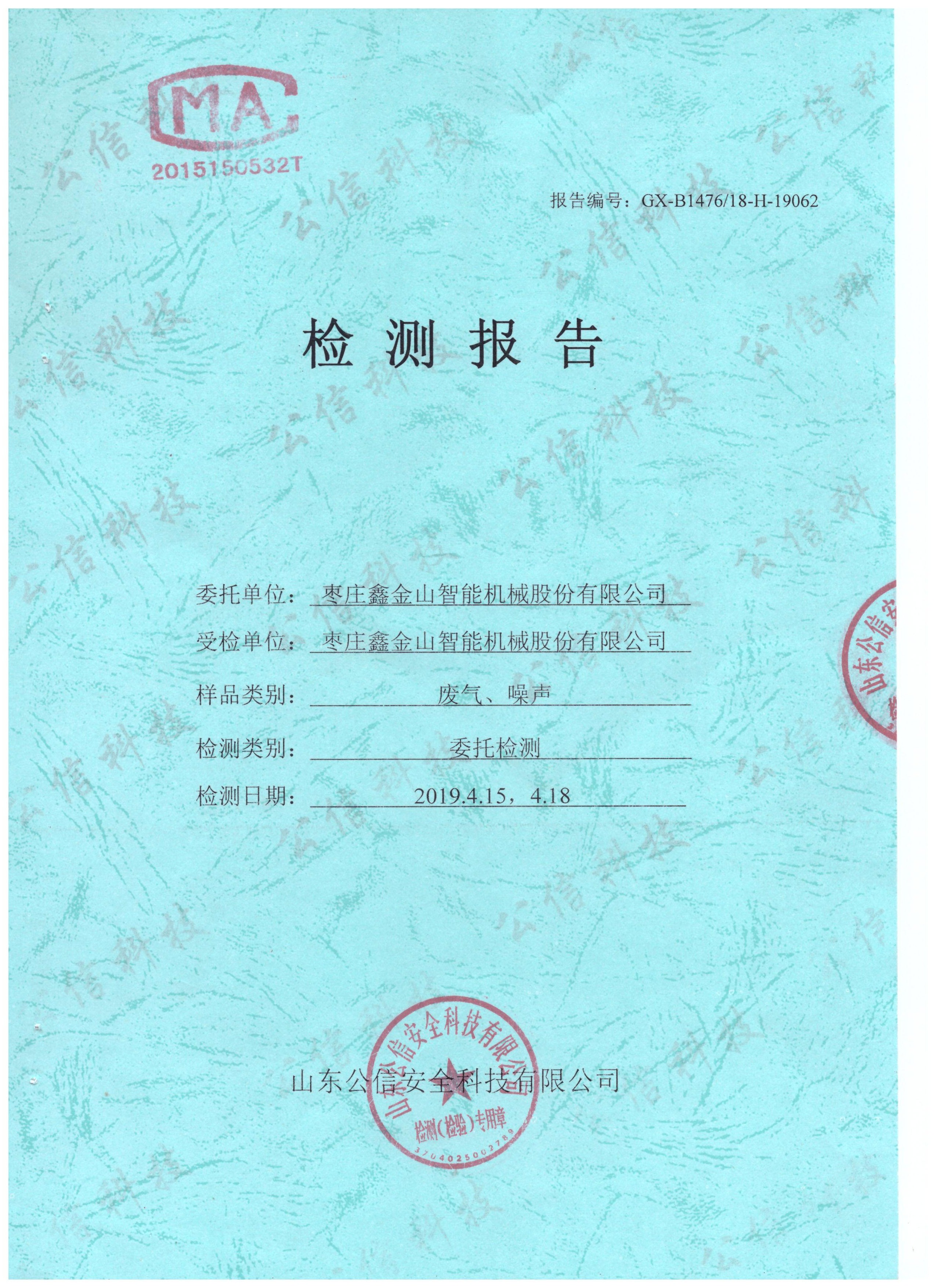 導(dǎo)讀:受檢單位:棗莊鑫金山智能機(jī)械股份有限公司 委托單位:山東公信安全科技有限公司 檢測(cè)日期:2019.4.15 2019.4.18