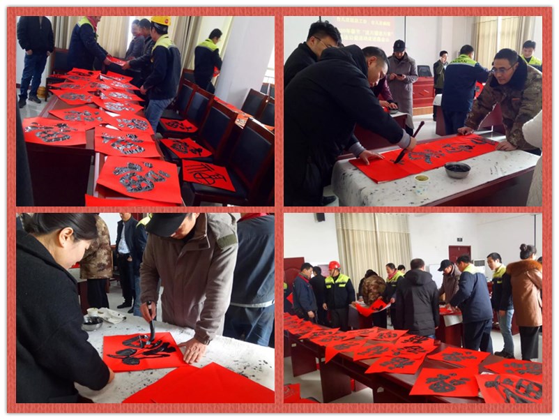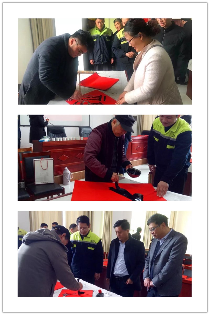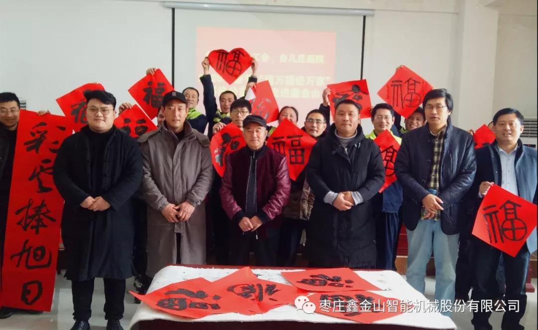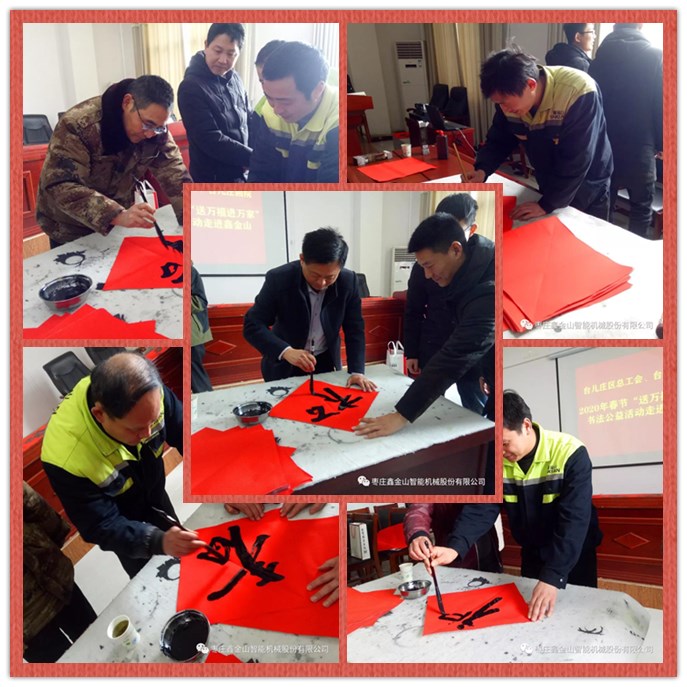 新春將至,為深入宣傳習(xí)近平新時代中國特色社會主義思想和黨的十九屆四中全會精神,弘揚(yáng)中華優(yōu)秀傳統(tǒng)文化,增強(qiáng)職工的幸福感,營造文明、健康、祥和的節(jié)日氛圍。1月10日上午,臺兒莊區(qū)總工會、臺兒莊畫院組織優(yōu)秀書法家走進(jìn)鑫金山,開展2020年春節(jié)“送萬福進(jìn)萬家”書法公益活動,為鑫金山員工們現(xiàn)場書寫“福”字和春聯(lián),送上了歡樂和春節(jié)祝福。
