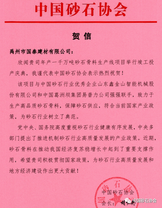 導(dǎo)讀:據(jù)中國(guó)砂石協(xié)會(huì)和中國(guó)砂石骨料網(wǎng)了解,2020年5月30日,禹州市國(guó)泰建材有限公司在河南省禹州市舉行年產(chǎn)1000萬(wàn)噸砂石骨料生產(chǎn)線項(xiàng)目竣工投產(chǎn)慶典暨開(kāi)業(yè)儀式,該項(xiàng)目投資2億余元,占地150余畝。慶典在行業(yè)“首創(chuàng)”采用現(xiàn)場(chǎng)直播方式。中國(guó)砂石協(xié)會(huì)會(huì)長(zhǎng)胡幼奕發(fā)來(lái)賀信,對(duì)項(xiàng)目的竣工投產(chǎn)表示祝賀。