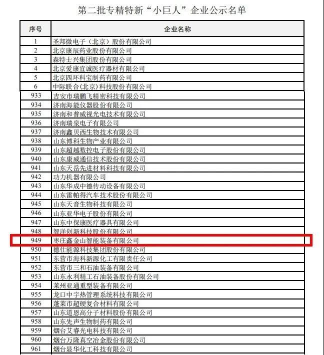近日,guojia工業和信息化部正式公布了第二批專精特新“小巨人”企業名單。棗莊鑫金山智能裝備有限公司憑借專業的技術與研發能力、強大的創新能力、極具潛力的市場開拓能力和優異的經營管理能力成功入選,榮獲guojia級專精特新“小巨人”企業榮譽稱號。標志著鑫金山在自主創新、科研應用、市場拓展和行業領先性等方面又邁出了一大步。