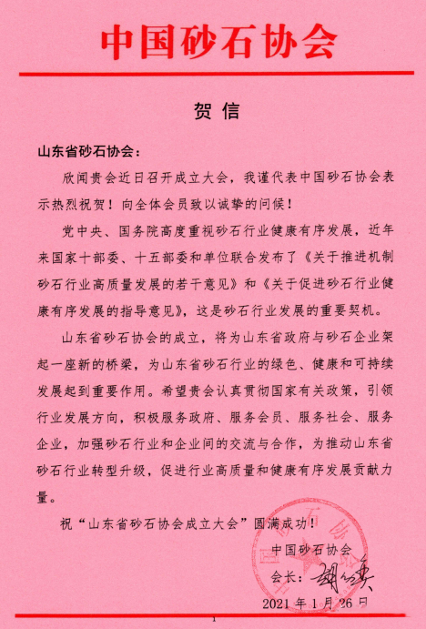 中國砂石協會會長胡幼奕賀信