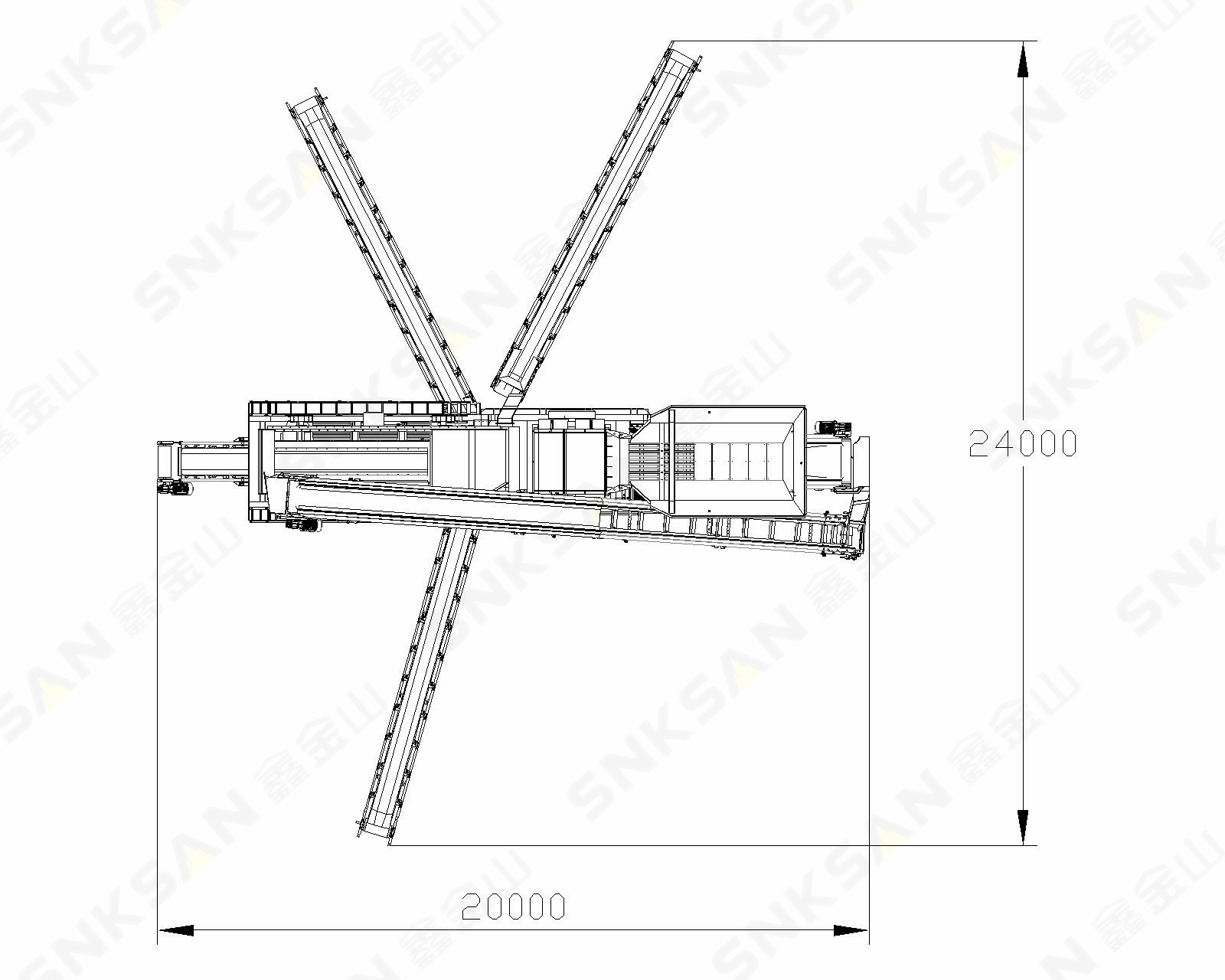 整機(含外掛皮帶機)工作時,占場地尺寸長20m*寬24m。程度節約了占地空間,適合場地空間狹小的現場。
